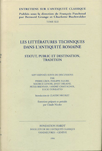 Nicolet 1996 : Cl. Nicolet [éd.], Les littératures techniques dans l'Antiquité romaine. Statut, public et destination, tradition. Sept entretiens suivis de discussions (Fondation Hardt. Entretiens sur l'Antiquité classique, 42), Vandoeuvres-Genève, 1996, 260 p.