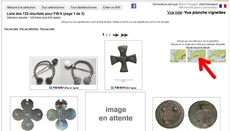 Artefacts stellt Verbreitungskarten zur Verfühgung, auf denen die genannten Fundplätzen automatisch angezeigt werden. Drei verschiedene Karten stehen zur Auswahl, auf denen man die Verbreitung eines Typus, oder einer gräosseren Anzahl von Typen eingeben kann.Im ersteren Fall, Suche durch einen Begriff (zB 'Siegelkapsel') besser, je doch durch Eingabe von einem Code (hier zB 'BTS-'). Auf der ersten Seite, die eine Liste von Ergebnissen anzeigt, werden drei Karten in drei Massstäben (Frankreich und seine Nachbaländer angezeigt; zweite Karte Europa; dritte Karte : Mittelmeer mit Anreinern). Zugang zu entsprechenden Karten : in der rechten oberen Ecke der Karte erschein ein Fenster, mit dem Angabe zur Suche ; dieses Fenster kann durch anklicken in eine andere Ecke plaziert werden.