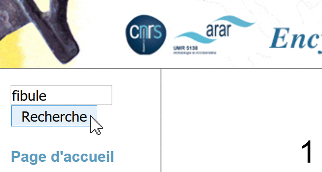 | On peut également rechercher le nom d'un auteur cité dans une fiche, le nom d'une commune ou encore un département : dans ce cas, saisir le numéro de département entre crochets, par exemple : '[34]'. Pour chercher les objets d'une période déterminée, utiliser le code de l'objet (pour la liste des codes de catégories et de périodes, voir Codes) suivi de celui de la période, séparés par un tiret. Exemple : FIB-3 pour trouver toutes les fibules du Deuxième Âge du Fer. NB : avec le menu Recherche de gauche, mieux vaut chercher un code qu'un mot (par exemple, 'PRL-' plutôt que 'perle'), les résultats seront plus précis. |  |