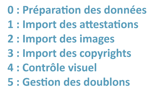 Avant l’import, vous devez préparer deux tableaux (fichier_attestations, fichier_copyrights) ainsi que vos images. Très important : Avant de commencer, assurez-vous de l’existence dans Artefacts de toutes les fiches, sites, musées et références bibliographiques utilisées dans vos données. Tant que vos données ne seront pas cohérentes, c’est-à-dire avec une graphie absolument identique à celle déjà enregistrée dans Artefacts, votre fichier d’import restera bloqué à l’étape 1 sur 5 jusqu’à ce que les corrections nécessaires aient été apportées. Les noms des en-têtes et l’ordre des colonnes des tableaux fournis ne doivent en aucun cas être modifiés. Dans le premier tableau, fichier_attestations, que vous pouvez télécharger ci-dessous aux formats (.xlsx et .ods), figurent les champs habituels des lignes d’attestations (* : champ obligatoire) : - Fiche* (ex. FIB-4001) - Commune* - Lieu-dit - Département - Pays* - Musée - Coll. - N° inventaire de l'objet - Dimensions - Contexte - Datation - Variante - Remarque - Liens - Bibliographie … ainsi que le champ supplémentaire suivant : - nom_image. Si votre import contient des images, ce champ est très important : il permet d’associer l’exemplaire à son image et à ses informations (nature et auteur). Il est important de ne pas écrire l'extension du fichier. Si vous avez plusieurs images pour un même objet, les noms de celles-ci doivent être séparées par un slash / dans cette colonne nom_image. Evitez d’avoir plusieurs objets sur la même image. Vos images doivent être au format .jpeg, en 300 dpi et être nommées de la même façon que dans le fichier_attestations. Si certains noms ne correspondent pas lors de l’ajout des images, Vous ne pourrez pas passer à l'étape suivante tant que les corrections n'auront pas été apportées. Dans le second tableau, fichier_copyrights, que vous pouvez télécharger ci-dessous aux formats (.xlsx et .ods), figurent quatre colonnes : - nom_image (qui doit exactement correspondre aux noms donnés dans le fichier_attestations, toujours sans extension et aux images) - nature (photographie, DAO, dessin, restitution) Attention, évitez les majuscules ! - auteur (format : P. Nom) - organisme (nous contacter pour la graphie à adopter) A retenir : les noms des images doivent correspondre aux données des colonnes nom_image du fichier_attestations et du fichier_copyrights. Si le nom_image d’une ligne ne correspond pas ou si une ligne d’information manque (ces informations sont obligatoires), vous ne pourrez pas accéder à l'étape suivante tant que les corrections n'auront pas été apportées. |